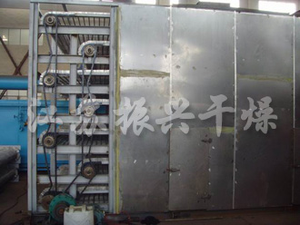 1、料鬥中的物料由加料器經輸送帶均勻地鋪在網帶上,網采用12-60目不鏽綱絲網,由傳動裝置拖動在幹燥機內(nèi)移動。幹燥段由若幹個熱風獨立循(xún)環單元組(zǔ)成,其中部分尾氣由專門排濕風(fēng)機排出,每(měi)一單元排出氣量均有調(diào)節閥控製。在上循環單元中,循(xún)環風機出來的風由側(cè)麵風道(dào)進入下腔,氣流向上通過(guò)換熱器加熱,並經分(fèn)配器分配後,成噴射流吹向網帶,穿過物料後進入上腔(qiāng)。幹燥過程是熱風氣流(liú)穿過物料(liào)層,完成熱(rè)量與質(zhì)量傳遞的過(guò)程。上腔(qiāng)由風管與風機(jī)入口相連,一部分氣體循環,一部分溫度(dù)較低含濕量較高的氣體作為廢氣經排濕管、調節閥、排濕風機排出。下循環單(dān)元中,循環風機出來的風(fēng)先進入上腔,下腔(qiāng)由側麵風道及回風管與風機入口相(xiàng)連,大(dà)部(bù)分氣循環,一部分排出,上下循環單元根據用戶需要可靈活配備,單元數量亦可根據需要選取。