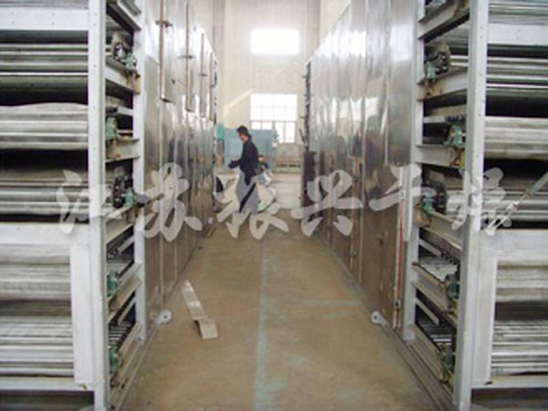 2、用於脫水蔬(shū)菜,一(yī)般使用三套設備串聯使用(yòng),形成初幹段、中間段及終幹段。在初幹段中,由(yóu)於物料含水量高,透氣(qì)性差,故采用小的鋪料厚度,較快的運行速度及較高的幹燥溫度。對物料溫度不(bú)允許超過60℃的料,初幹段中,幹(gàn)燥氣體溫度可高達120℃以下,終幹段內物料(liào) 停留(liú)時間是初幹段的3-6倍,鋪(pù)料厚度是初幹(gàn)段的2-4倍。對於物料溫度不超過60℃的(de)要求,可采用80℃左右的幹燥氣體。采用多段組合能更好的發揮帶式幹燥機的性能,且幹燥更均勻。